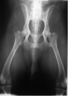 | Asimmetria del bacino. Il lato del bacino in cui il ramo dell’ileo appare più stretto è sollevato dal tavolo radiografico, mentre quello che appare più largo è inclinato verso il tavolo. L’asimmetria del bacino comporta una errata valutazione della congruenza articolare e dell’angolo di Norberg perché migliora artificiosamente la congruenza articolare del lato sollevato e peggiora quella del lato abbassato. |